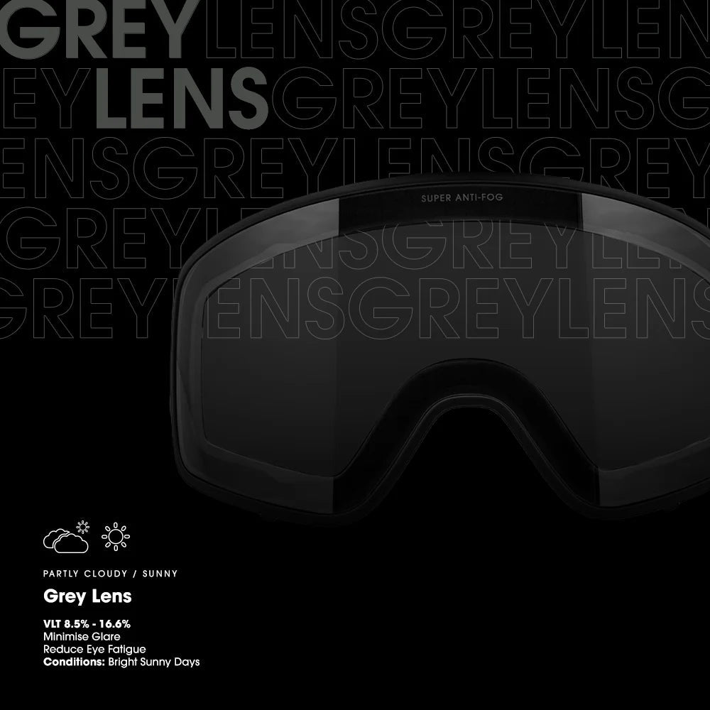 Unlock ultimate clarity and protection with CARVE's Grey Lens, your go-to for navigating the slopes under partly cloudy and sunny skies. These lenses boast a natural colour perception, providing you with a true-to-life view while cutting down on glare and reducing eye fatigue. The grey tint ensures that even in the brightest conditions, your vision remains sharp and unobstructed.